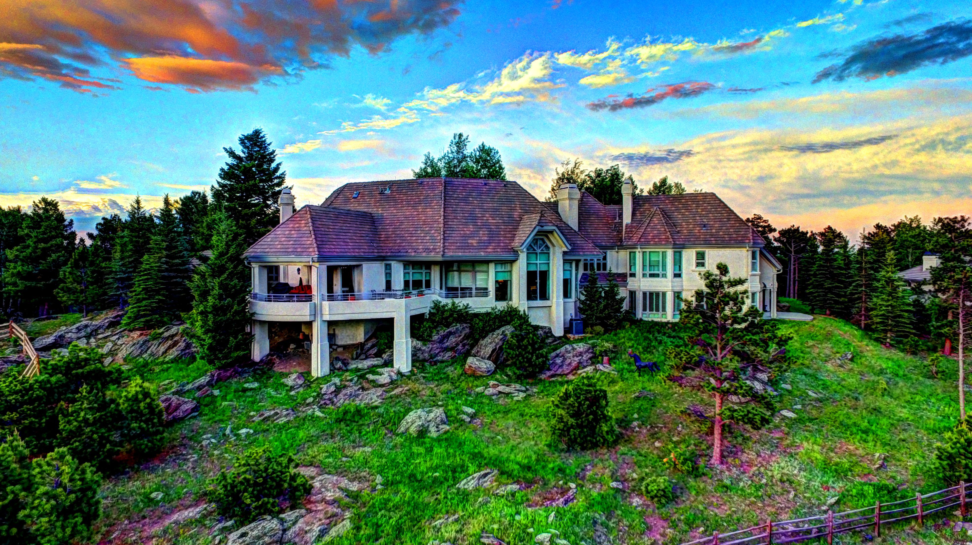 A few steps into the home your breath will be taken away by the panoramic views of Elk Meadow and Bergen Park. The wall of windows provide awe-inspiring views from every direction. The expansive vaulted great room with chandeliers, cast stone fireplace, auto window shades throughout, provide the perfect ambiance for entertaining or just relaxing and enjoying the serenity of the evening sunsets.
