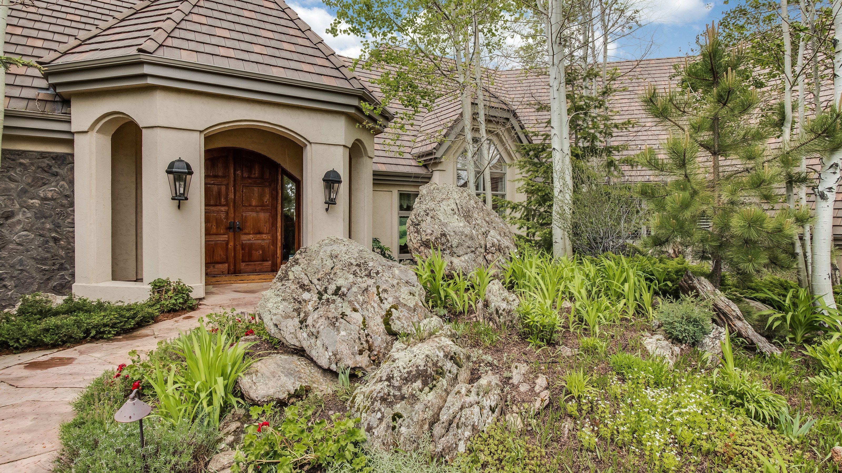The home site is very private with stone path gated entry. Upon entry you are in your own secret garden with amazing rock outcroppings and a serene setting around an abundant water feature! Outside there is extensive stonework, additional entry through the laundry/mud room .